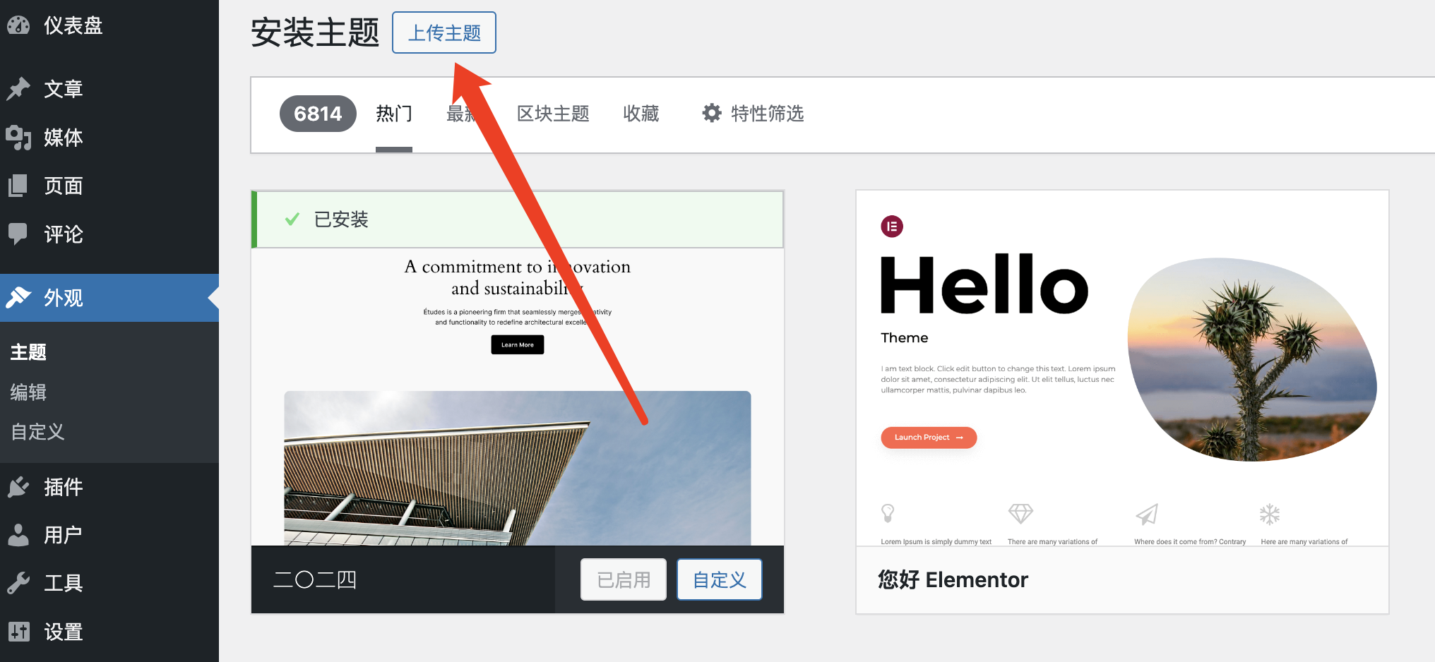 下載WordPress主題文件后你會得到一個文件壓縮包,到「后臺-外觀-主題」點擊「安裝新主題」,然后上傳主題壓縮包文件,之后啟用該主題即可。