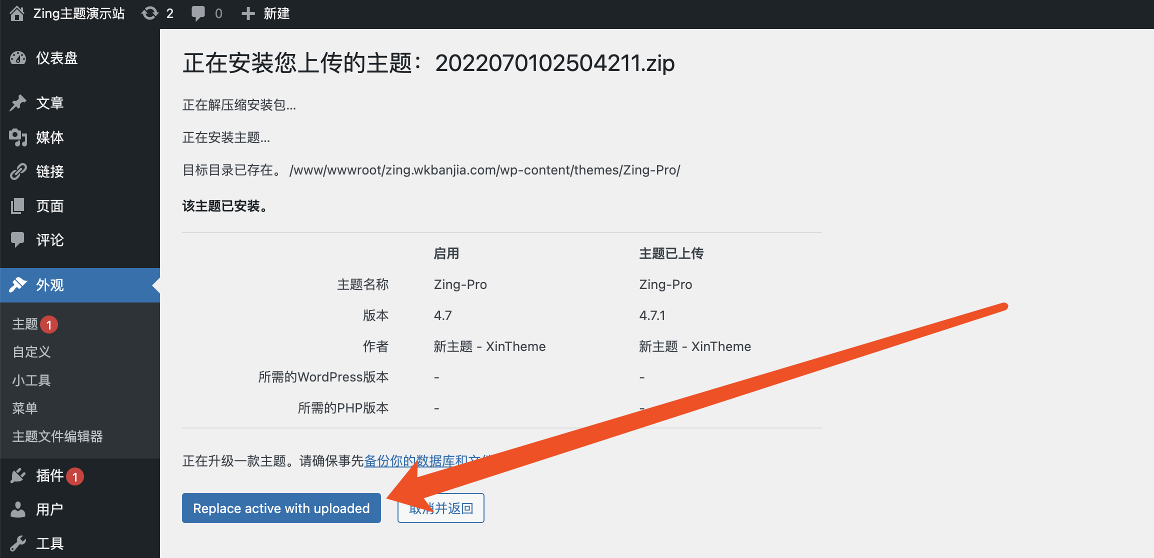 1、在已授權(quán)狀態(tài)下,后臺會顯示主題更新,直接到「后臺-外觀-主題」點擊更新即可。