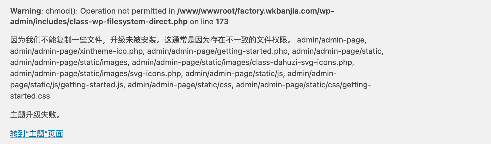 這是因為服務(wù)器文件夾權(quán)限問題造成的,把「wp-content」文件夾給予755或者775權(quán)限,重新到后臺更新主題即可。