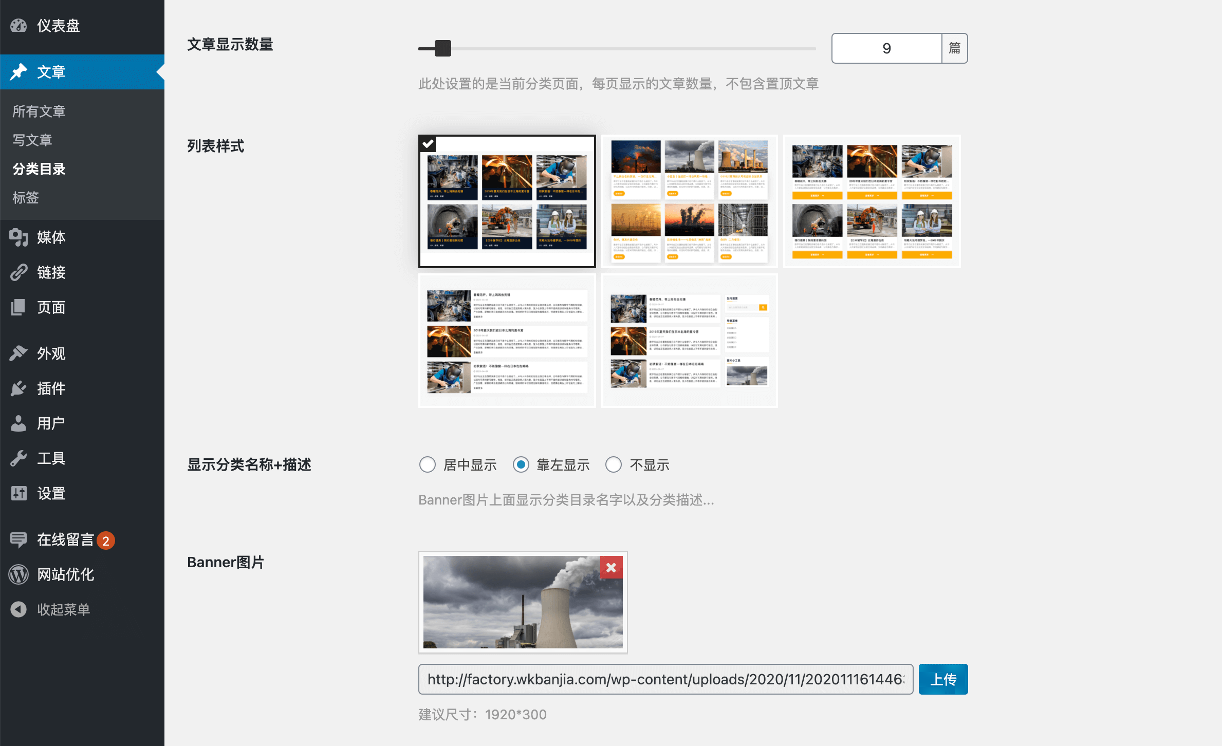 Factory主題目前有5種列表樣式,可在「后臺-文章-分類目錄-編輯」中進行選擇。