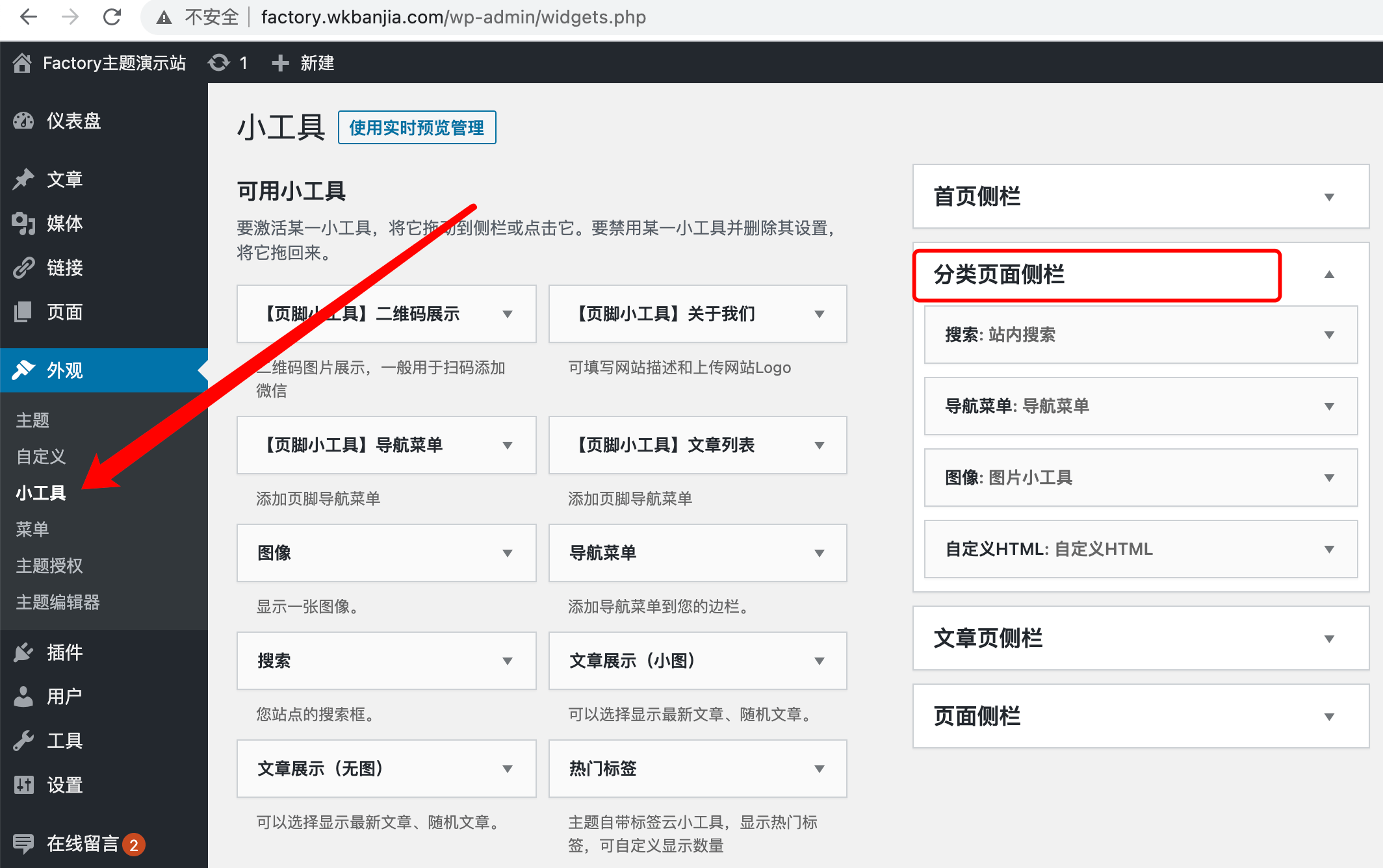 如果選擇了「列表樣式-5」還需要設置一下側欄小工具,到「后臺-外觀-小工具」中進行設置。將需要添加的小工具放至「分類頁面?zhèn)葯凇?/strong>中。