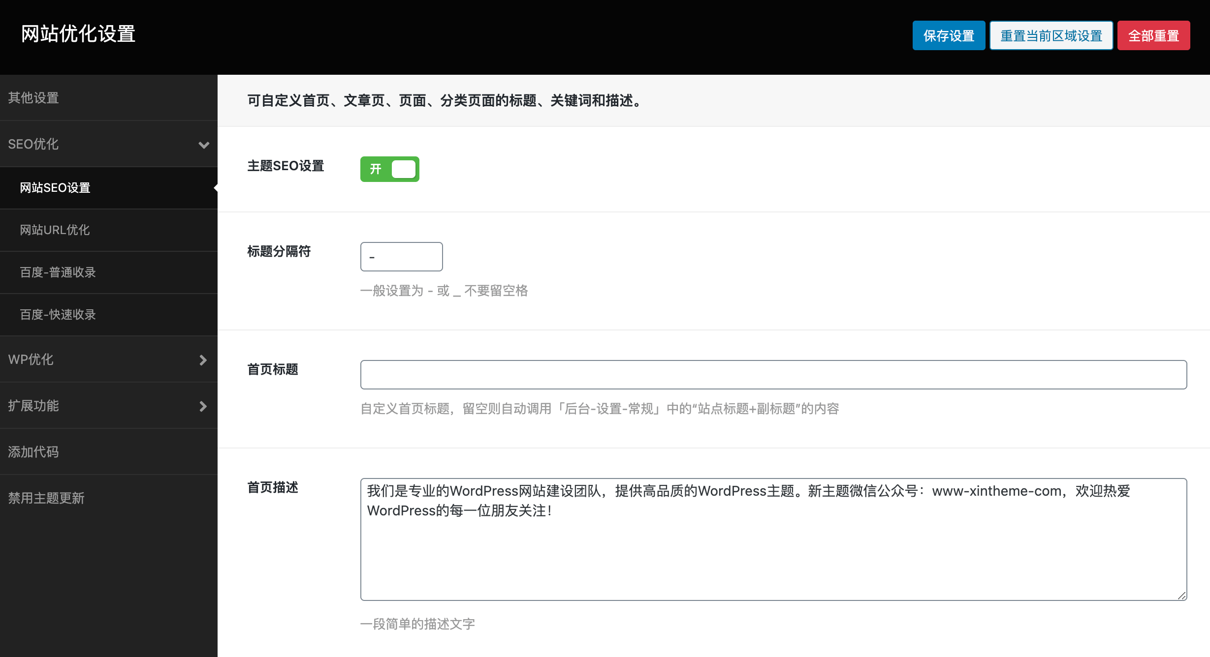我們的WordPress主題都自帶SEO設(shè)置,可自定義網(wǎng)站首頁(yè),分類頁(yè)面、文章頁(yè)面,獨(dú)立頁(yè)面的標(biāo)題、關(guān)鍵詞和描述。