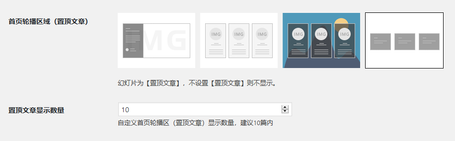 主題預(yù)設(shè)了4種幻燈片樣式,在【布局設(shè)置 - 首頁輪播區(qū)域】選擇你喜歡的樣式就好,可自定義顯示數(shù)量,如果沒有置頂文章則不顯示。