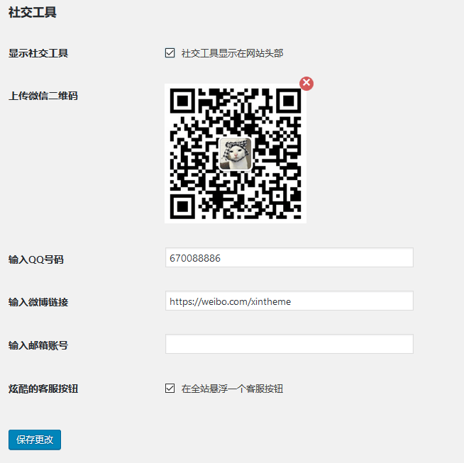 社交圖標(biāo),導(dǎo)航欄預(yù)設(shè)了4種社交工具,QQ、微博、微信、郵箱,勾選顯示【社交工具】的時候按需填寫就好了,不填寫則不顯示。