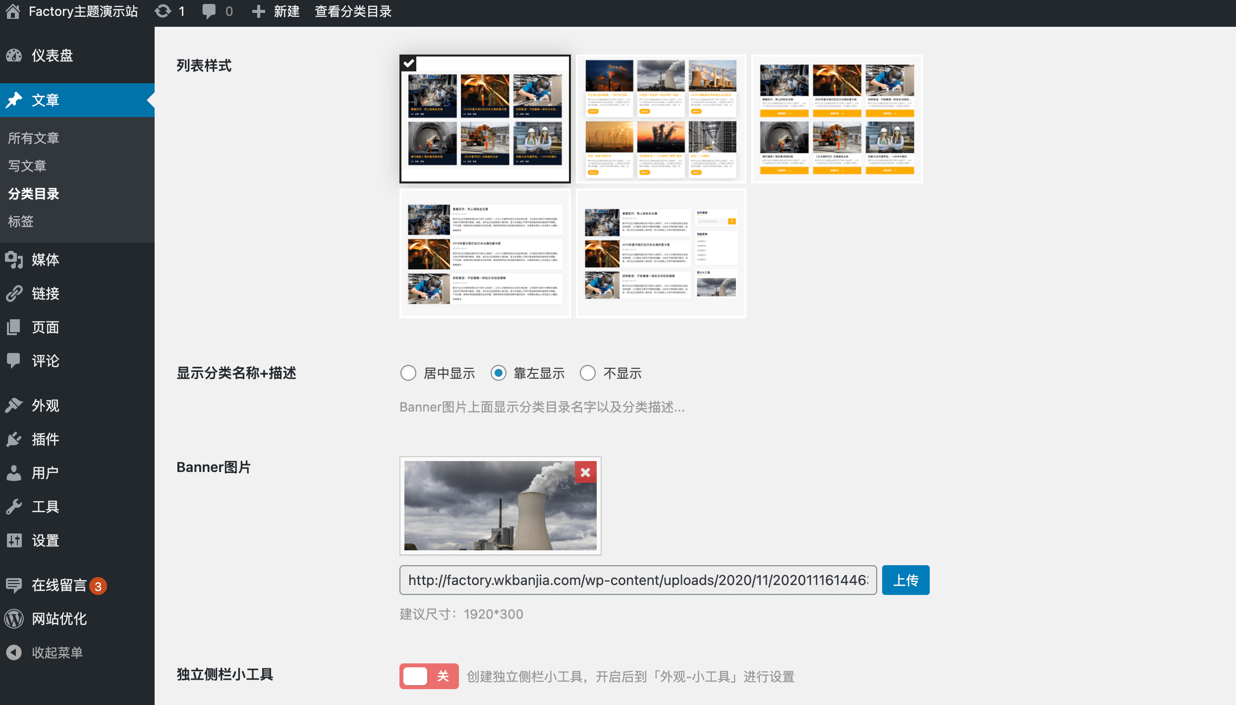 主題現(xiàn)階段有5種列表樣式,如果使用帶側(cè)欄的列表樣式,還支持為每一個(gè)分類列表設(shè)置獨(dú)立的小工具。