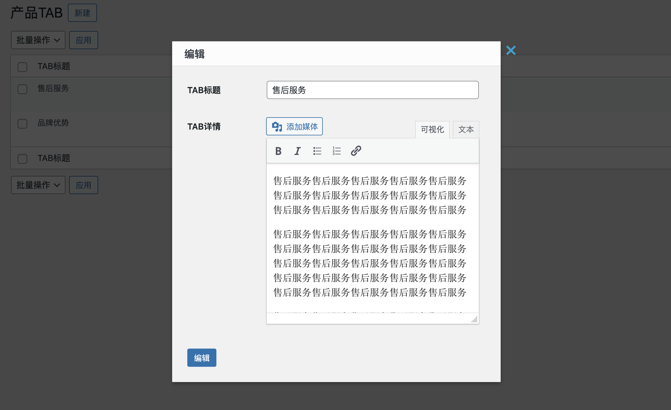 自定義TAB欄,可以全局設(shè)置,所有產(chǎn)品都顯示,也可以針對某一個產(chǎn)品單獨設(shè)置,非常靈活,TAB內(nèi)容支持解析短代碼。