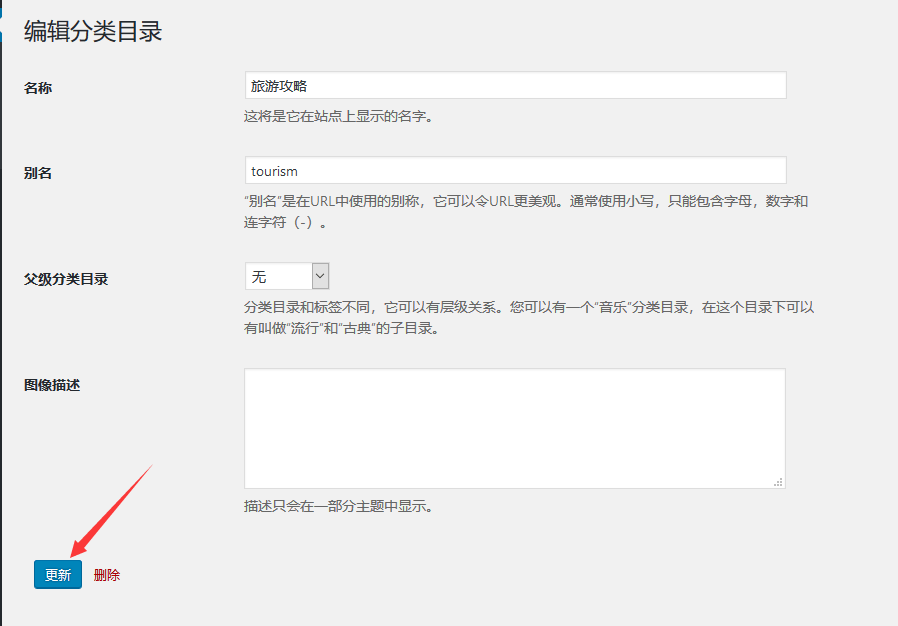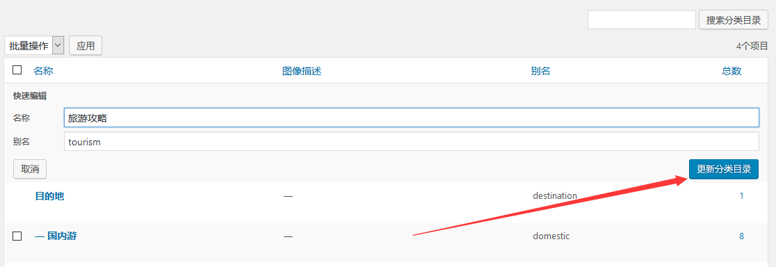 在這里,您只能編輯類別的名稱和別名,如下面的屏幕所示,最后點擊更新分類目錄按鈕。