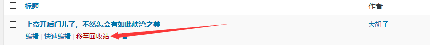 步驟(2) - 刪除文章。當鼠標懸停在文章標題上時,幾個選項會顯示在標題下面。點擊移至回收站選項刪除文章。