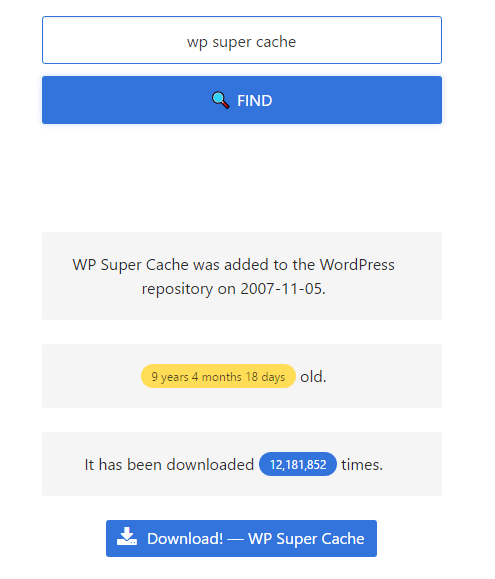 輸入插件名稱,可以看到WordPress插件的發(fā)布時間,截止到查詢時間的"年齡",插件的下載次數(shù)和下載地址,比如XinTheme查詢了:wp-super-cache: