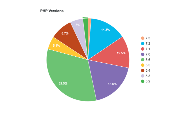 當前,依然有2%的網(wǎng)站運行在PHP 5.2上,有將近20%的網(wǎng)站運行在PHP 5.5及以下版本PHP版本上,而有50%的WordPress網(wǎng)站運行在PHP7.0及以上版本。