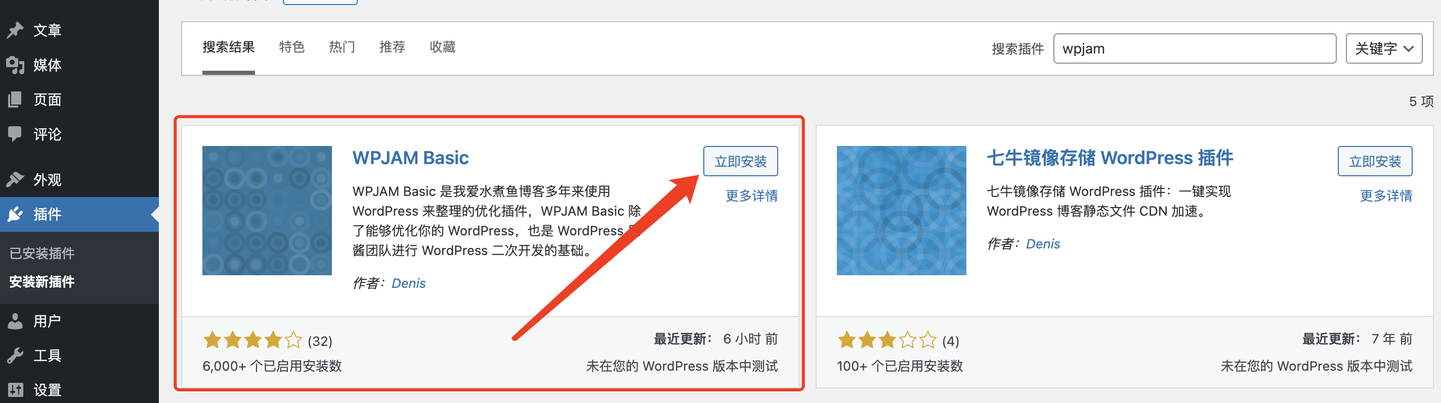 到「后臺-插件-安裝新插件」頁面,輸入:wpjam,搜索插件。