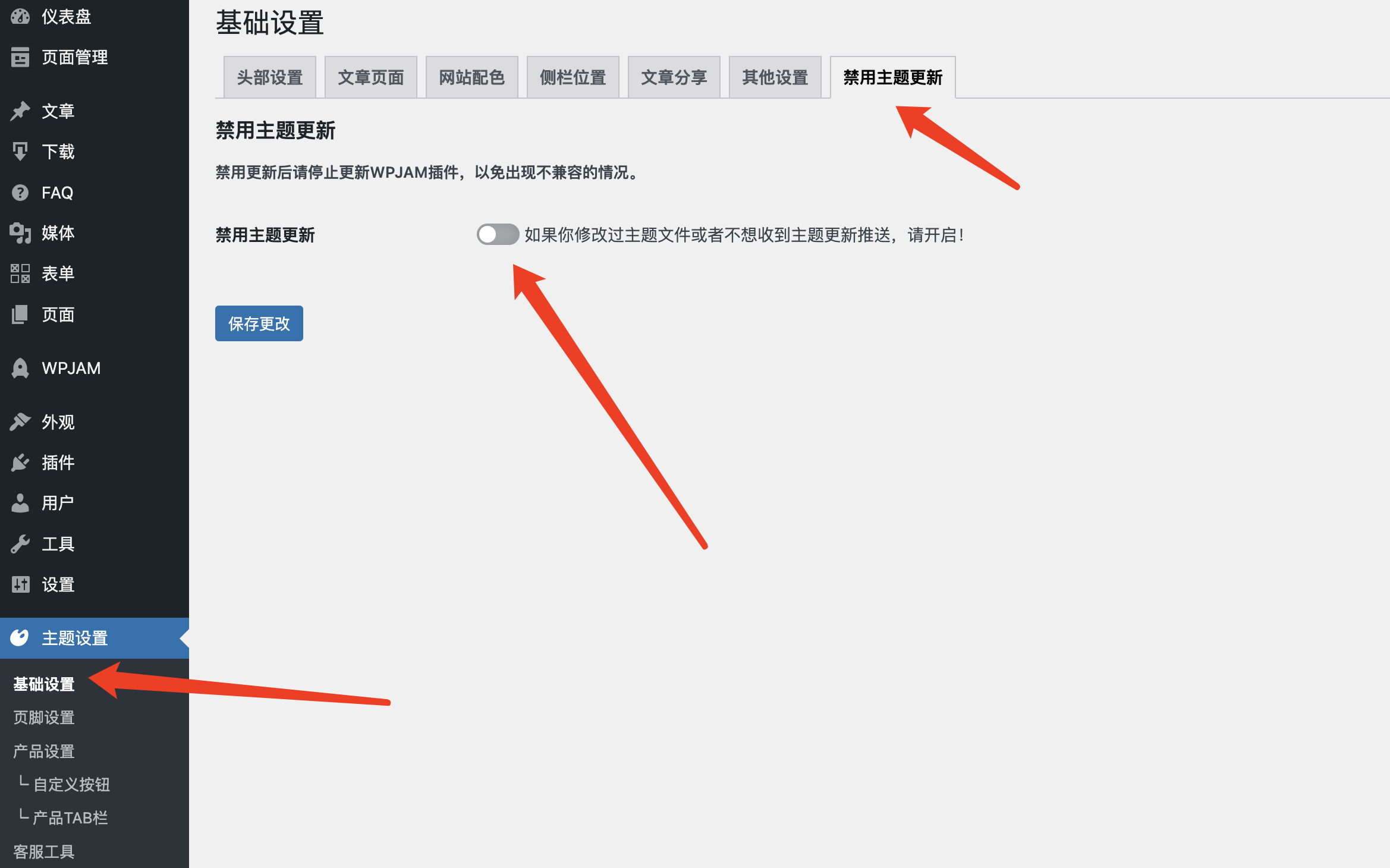 我們的WordPress主題提供了禁用更新的選項。如果你不再需要更新主題,可以在「后臺-主題設(shè)置-基礎(chǔ)設(shè)置-禁用主題更新」中開啟該選項來禁用更新。不過需要注意的是,這款 WordPress 主題是基于 WPJAM-Basic 插件開發(fā)的,因此在禁用主題更新后,建議也暫停 WPJAM-Basic 插件的更新,以避免潛在的不兼容問題。