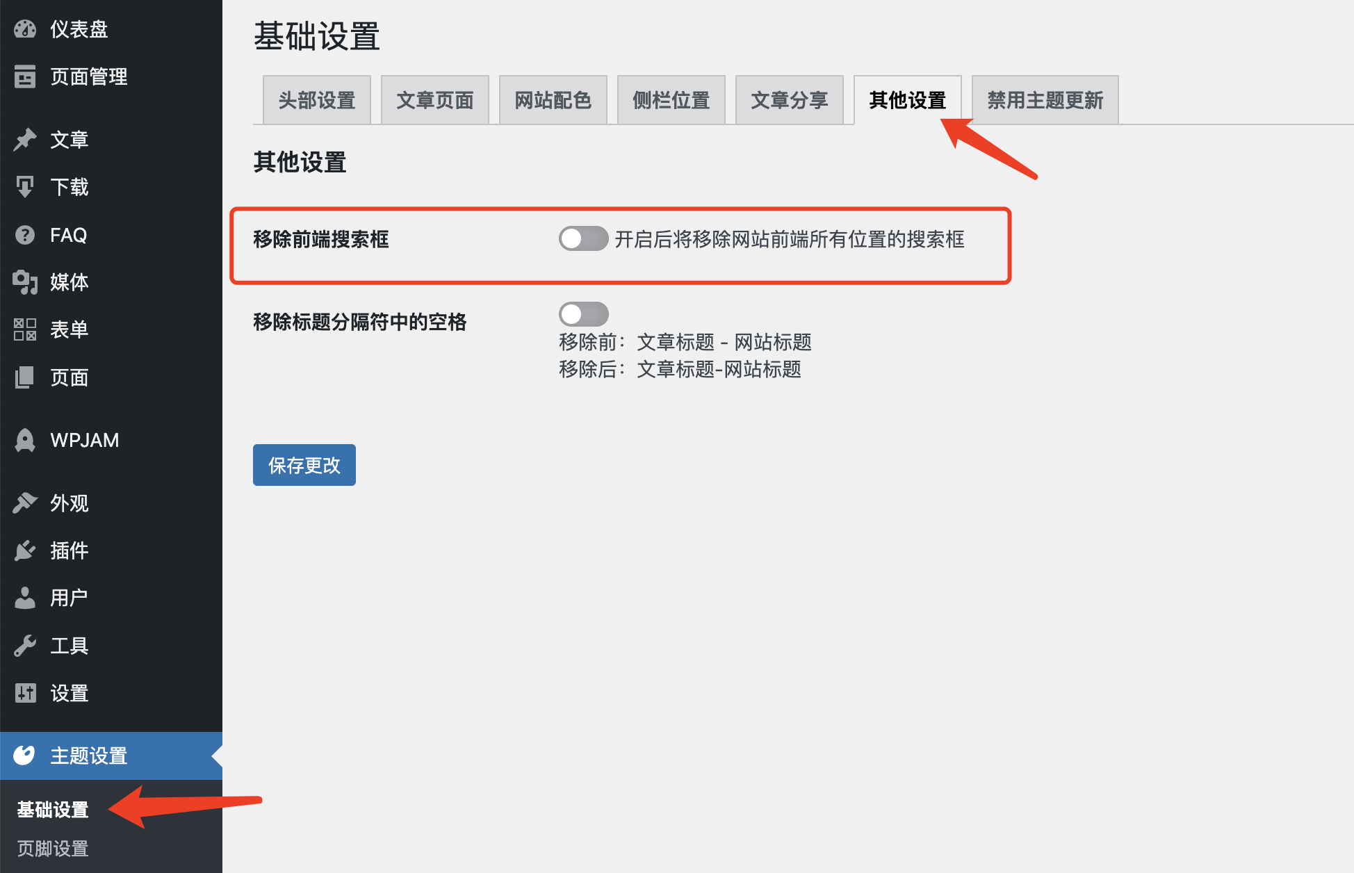 只需前往「后臺 - 主題設(shè)置 - 基礎(chǔ)設(shè)置 - 其他設(shè)置」中進行設(shè)置,即可輕松關(guān)閉搜索功能。