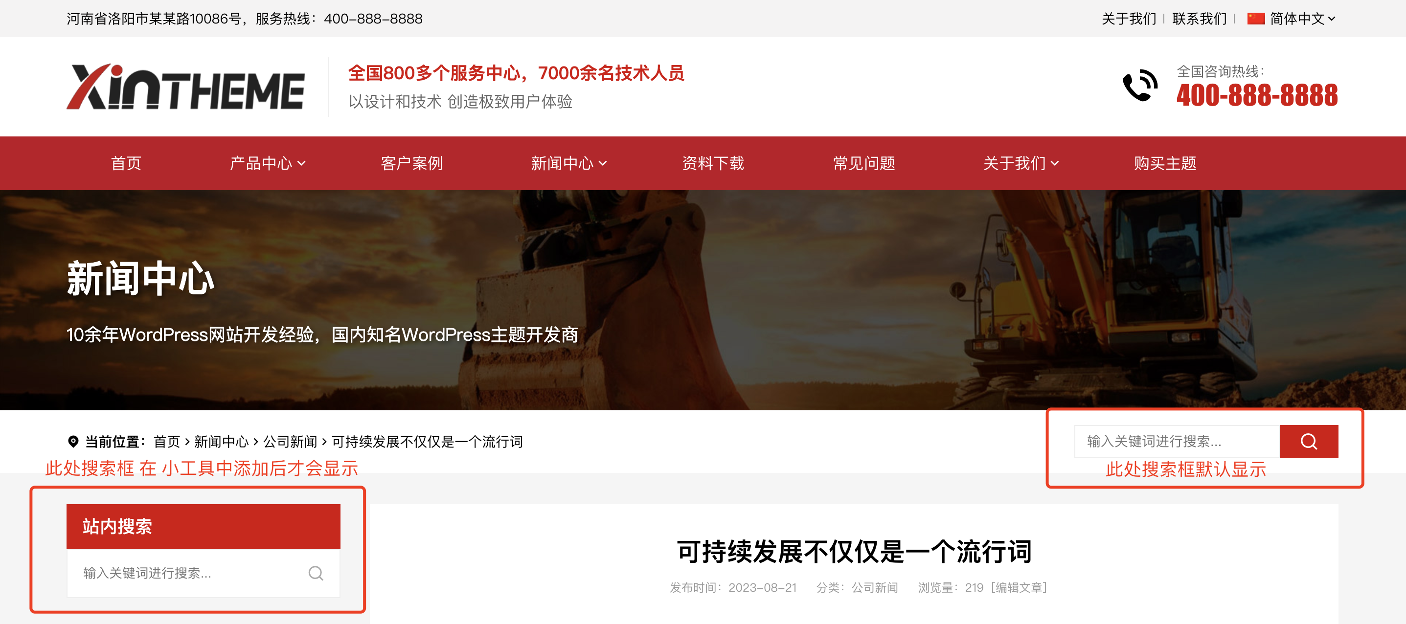 Modular主題在前端頁面的多個位置都支持顯示網(wǎng)站搜索框,例如面包屑導航和側(cè)欄小工具中。然而,有些用戶可能不需要網(wǎng)站的搜索功能,因此希望徹底移除搜索框。為此,我們也提供了一個相關(guān)選項。