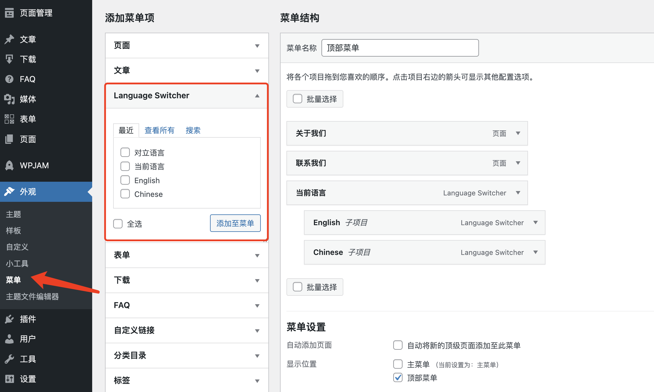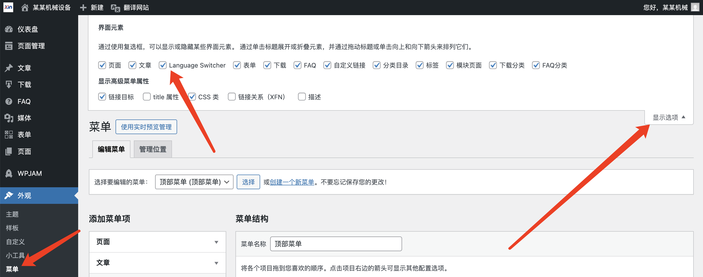 如果沒有看到多語言選項,點(diǎn)擊「后臺 - 外觀 - 菜單」頁面右上角的「顯示選項」,并勾選「Language Switcher」即可。