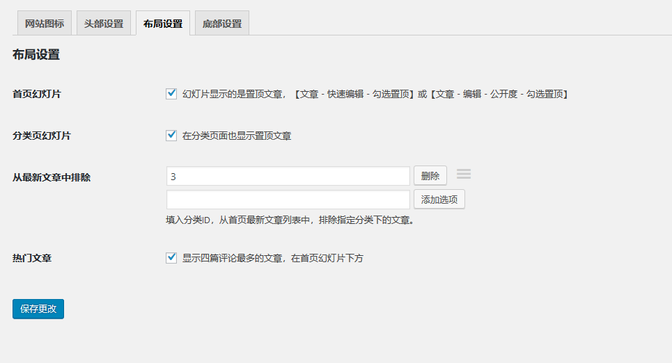 這里可以控制是否顯示首頁(yè)幻燈片、分類頁(yè)幻燈片、以及熱門文章(評(píng)論最多的文章)
