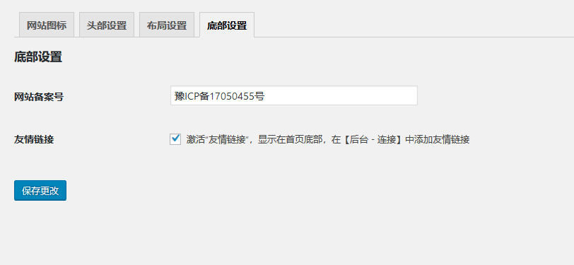 底部設(shè)置可填寫網(wǎng)站備案號(hào)和是否開(kāi)啟友情鏈接。