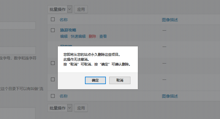 當(dāng)你點擊刪除時,你會得到一個彈出消息,要求確認(rèn)刪除特定的類別,如下圖所示。