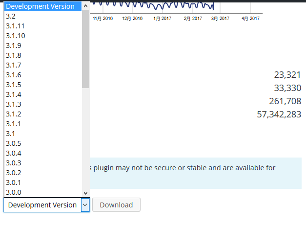 圖片右下角,有一個(gè)超鏈接:Advanced View,點(diǎn)擊進(jìn)去 可以看到插件的詳情:比如插件哪個(gè)版本當(dāng)前使用量最多,插件每天的下載量,插件的下載總量等,在頁面的最下面,可以看到插件歷史的所有版本,選擇具體的版本,可以點(diǎn)擊下載Download按鈕下載該插件。